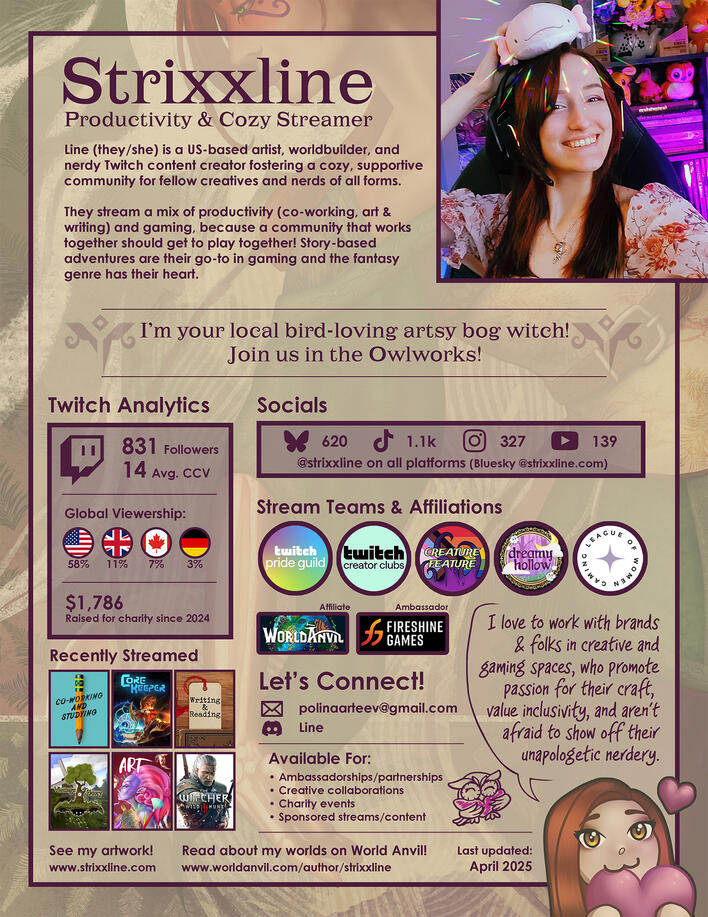 I'm Polina (a.k.a. Strixxline) and I am an artist and worldbuilder! You can catch me streaming my creative ventures over on Twitch, with some cozy gaming sessions sprinkled into the schedule!You can see my art and design work at the links below, on my website, Artstation, and Behance!